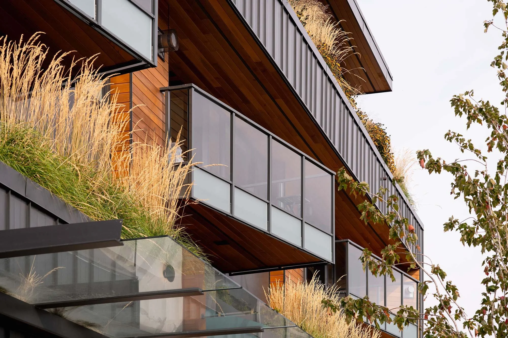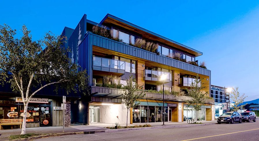 Cleveland Garden is a vibrant addition to the neighbourhood of downtown Squamish. Two new commercial spaces front onto the sidewalk and each feature a unique wood surround, colourful turquoise signage bands and are weather protected by a continuous glass canopy. The welcoming residential entrance is characterized by wood slat soffit and large format marble tiles creating warmth and harmony of materials. The upper residential floors feature exterior decks that are angled to maximize sun exposure while large overhangs provide respite from the rain. The exposed faces of the building feature metal siding to withstand the effects of inclement weather while the inside faces are more protected and clad in natural cedar wood siding. Cleveland Gardens is also distinctly defined by an abundance of native planting including wildflowers and grasses, bringing nature into the urban streetscape for both the residents and public to enjoy.