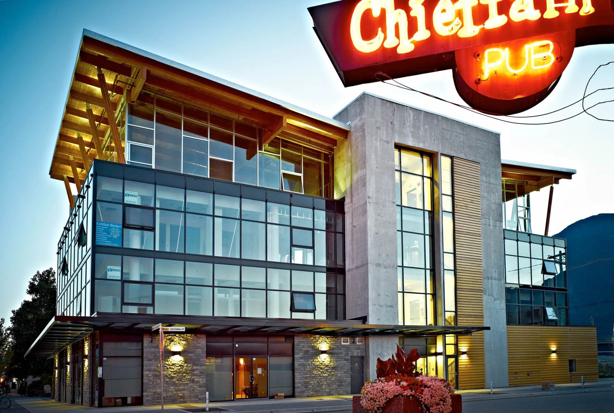 Heavy Timber, concrete, and glass are the primary components of this building. This simple, contemporary combination of structure and finish enabled the project to be built quickly with a modest budget. Timber beams, rafters, and wood soffit are used to maximum effect at the dynamic top floor roof. Locally quarried basalt stone is provided at the ground floor sidewalk level. Large vertical planes of cedar siding and slats complete the building’s west coast contemporary character while creating a defining landmark in downtown Squamish.