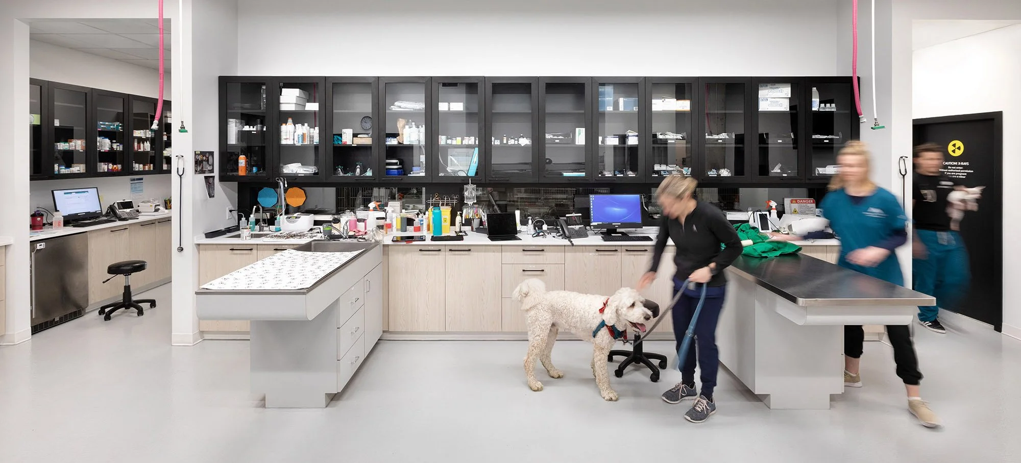 The vet clinic includes an inviting reception and waiting area finished with pale wood panels complemented with a cool light green palette and dramatic dark graphic images and accents. Examination rooms, surgery and preparation area, imaging and dental suite were planned and designed to meet the accreditation requirements for veterinary practice.